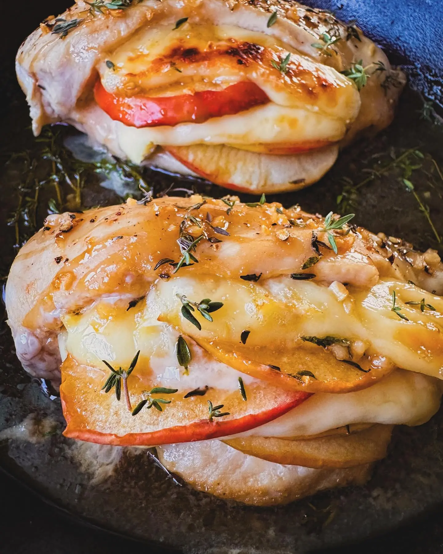 Slices of the chicken look beautiful on the plate, with melted brie spilling slightly over the apples. A drizzle of the reserved glaze and a sprinkle of fresh thyme complete the dish.