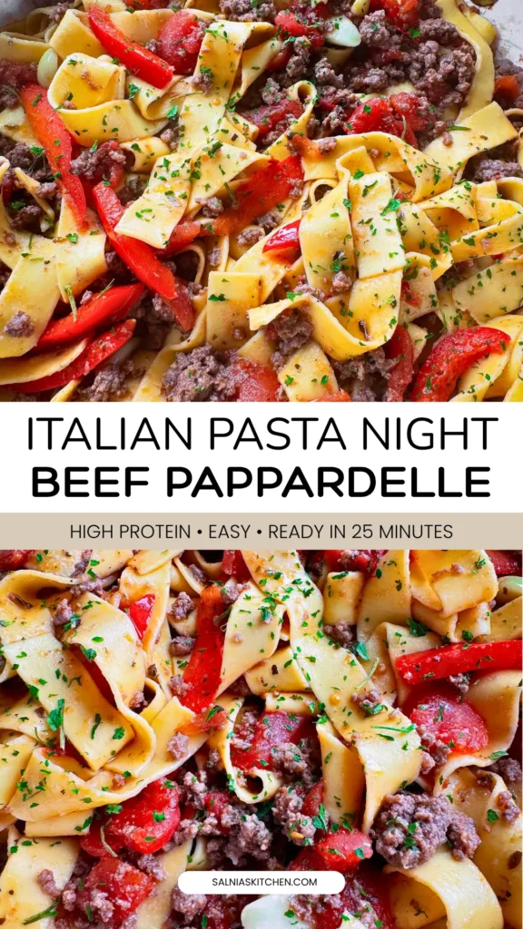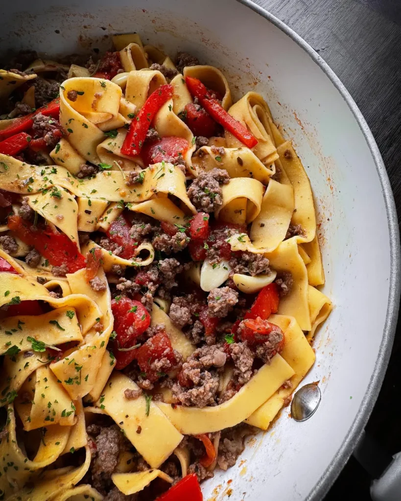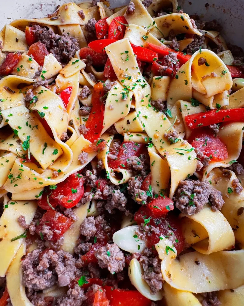 This pasta combines savory ground beef, juicy tomatoes, fragrant garlic, and herbs, creating a sauce that clings beautifully to wide pappardelle noodles.