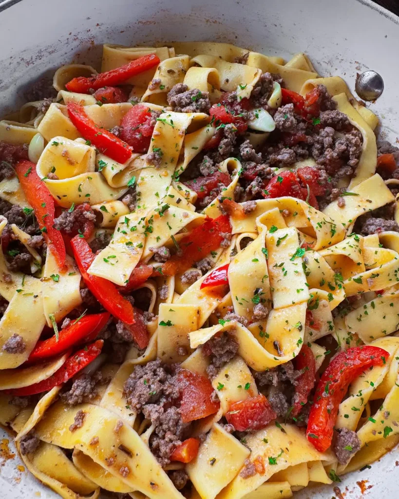Many pasta recipes rely on heavy sauces or complicated layers of flavor, but this beef and red pepper pappardelle pasta is all about balance.