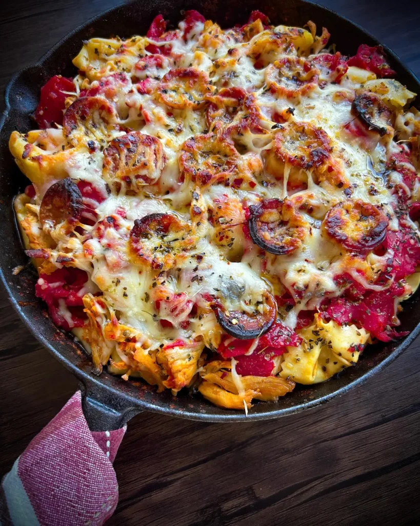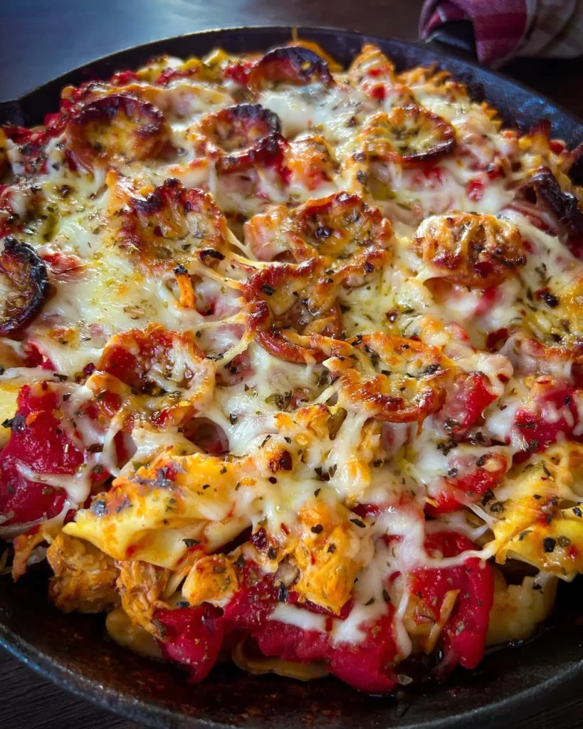 The recipe combines the best elements of three comfort classics. You get the tangy heat of buffalo chicken, the saucy richness of baked pasta, and the gooey topping of a cheesy pizza.
