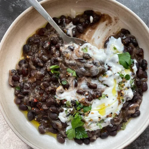 Many simple bean stews can taste plain or one-dimensional. This caramelized onion and black bean stew is the complete opposite—deeply savory, rich, and comfortingly hearty.