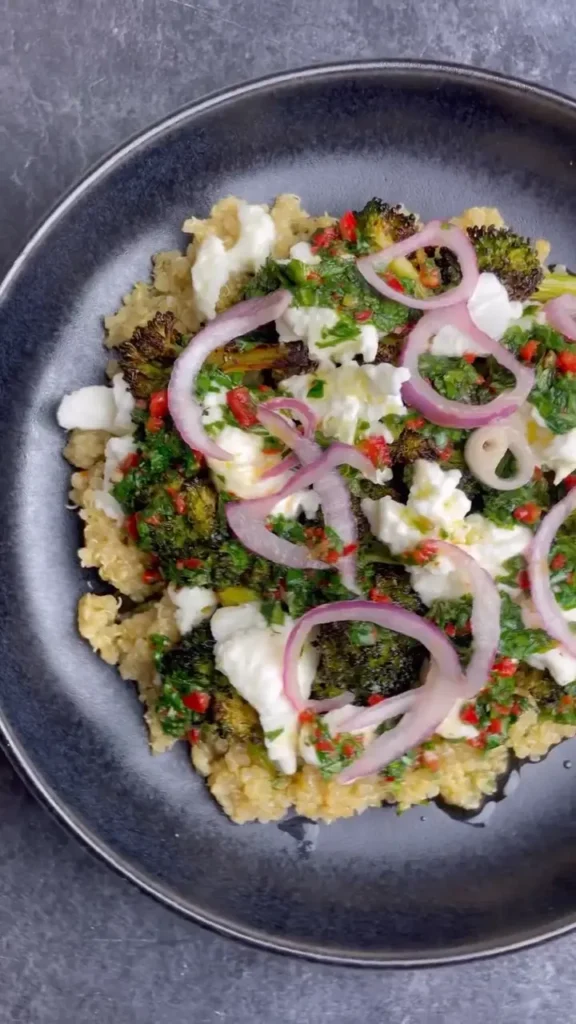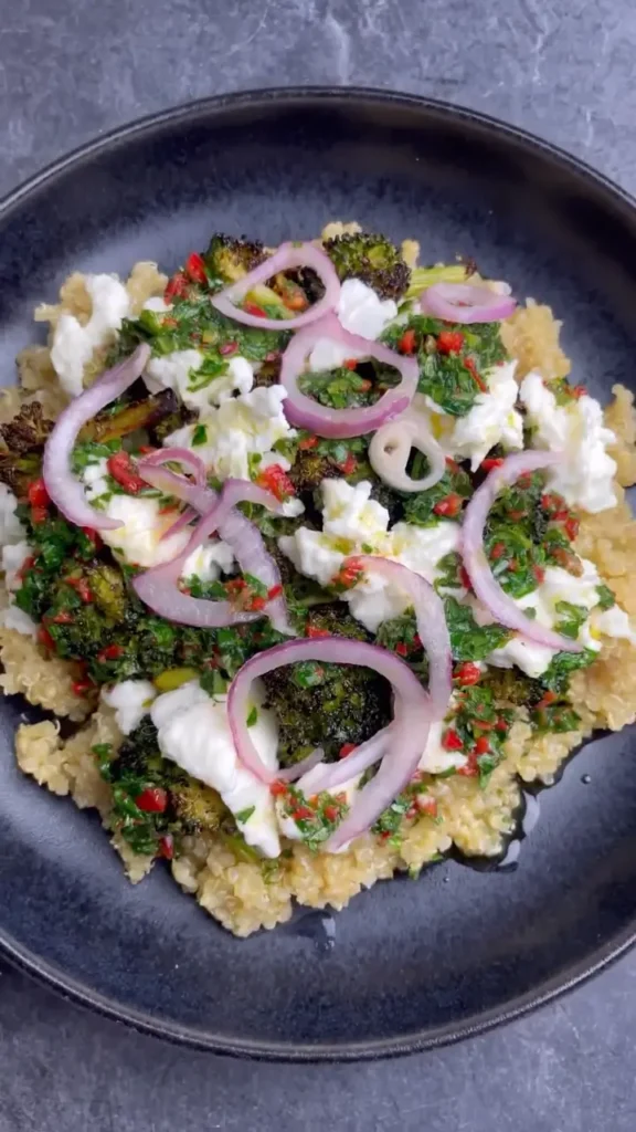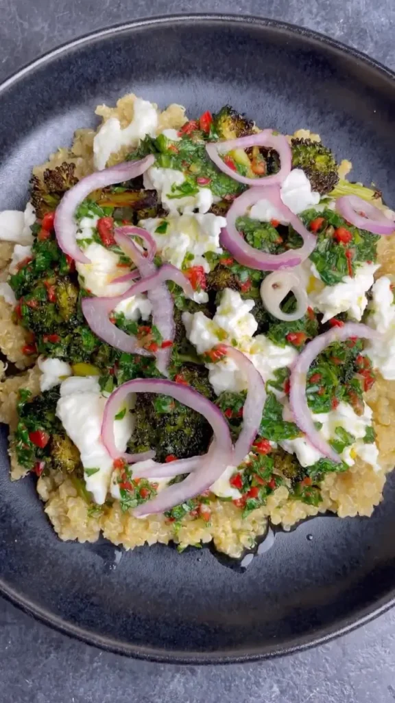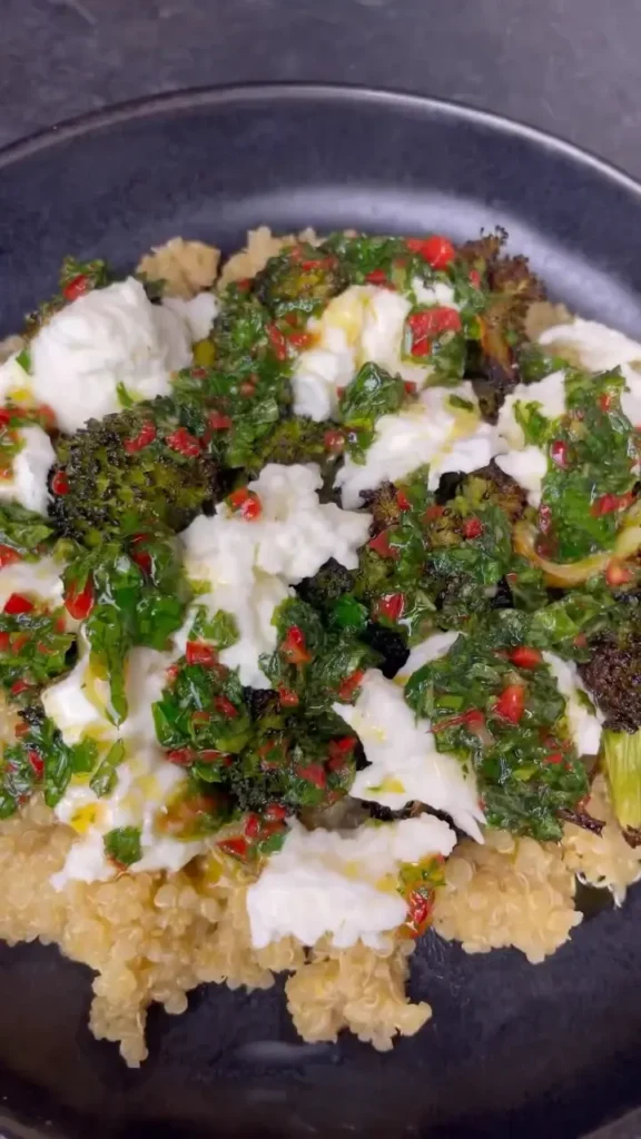 This dish transforms a simple bowl of quinoa and vegetables into something memorable. The combination of roasted broccoli, creamy mozzarella, and zesty mint salsa verde gives every bite contrast — crisp yet tender, rich yet refreshing.