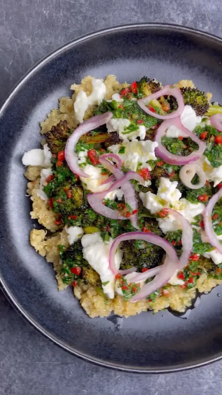 - Assemble the bowl by placing quinoa as the base, topping with roasted broccoli and torn mozzarella. Drizzle generously with the chilli-mint salsa verde and serve immediately.