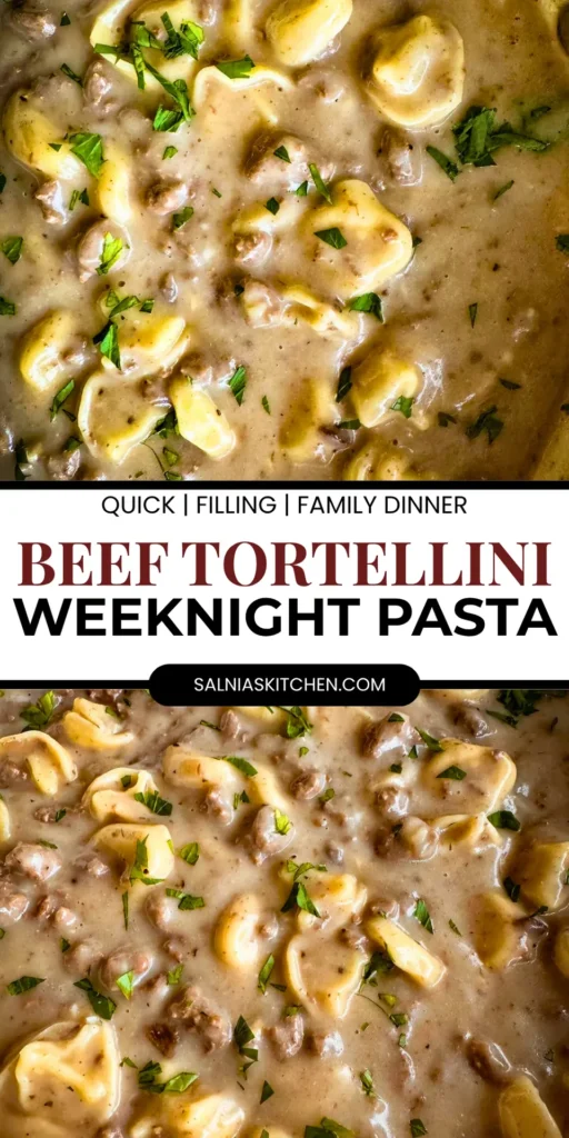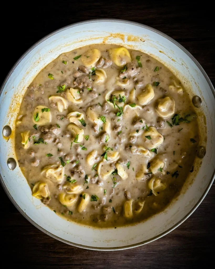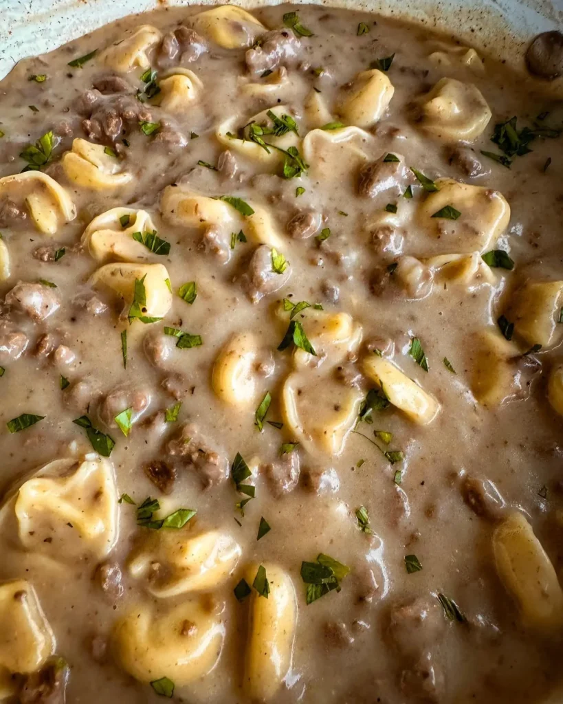 The beauty of this dish lies in its balance of flavors and textures. The ground beef adds savory depth, the tortellini bring cheesy richness, and the creamy mushroom sauce ties everything together into one comforting bite.