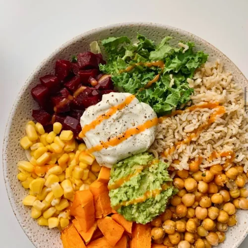 - Arrange roasted butternut, roasted chickpeas, corn, and diced beetroot over the greens.