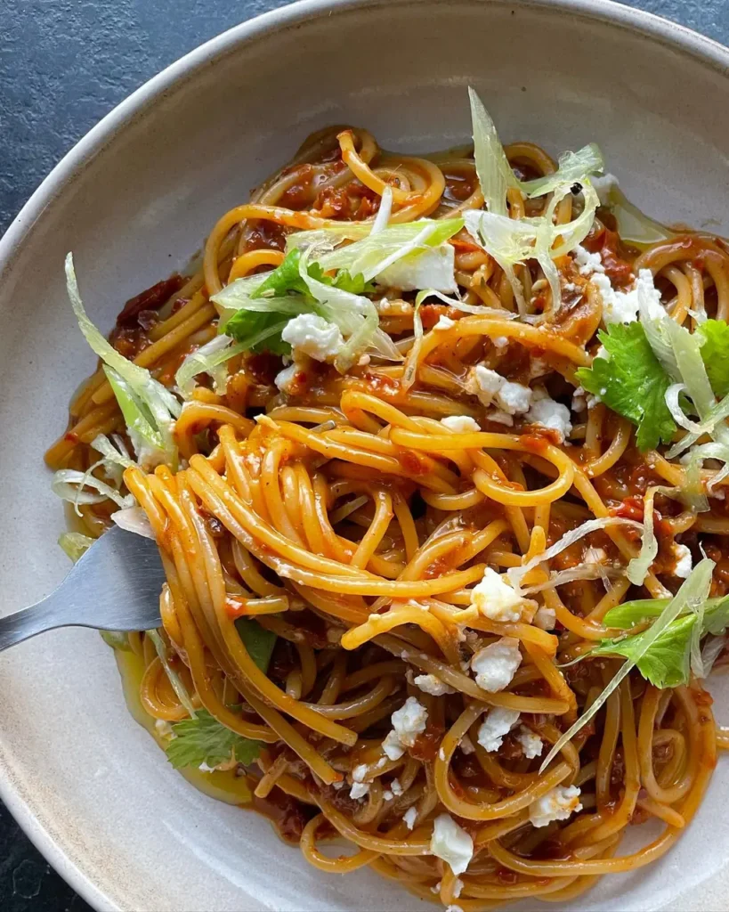 Then, scatter over the crisped spring onions and a few sprigs of fresh coriander for a bright herbal touch. The combination of colors — fiery red sauce, white feta, and green herbs — makes this pasta look as beautiful as it tastes.