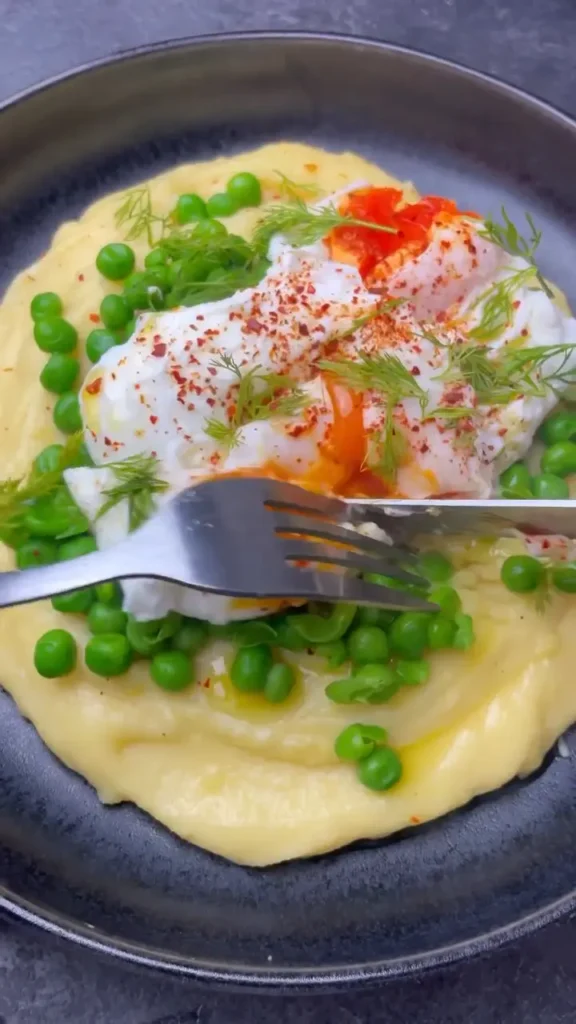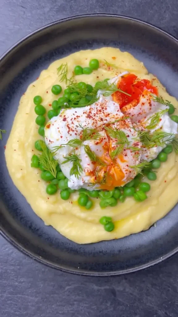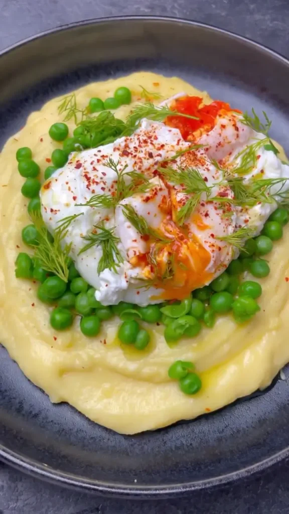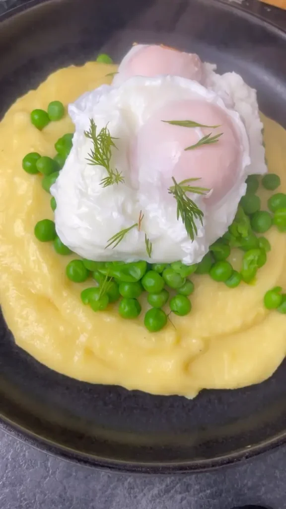 This version pairs Parmesan polenta with sweet peas and softly poached eggs, creating layers of texture and flavor. Each bite brings together savory richness from the cheese, the gentle sweetness of peas, and the lush creaminess of the egg yolk.
