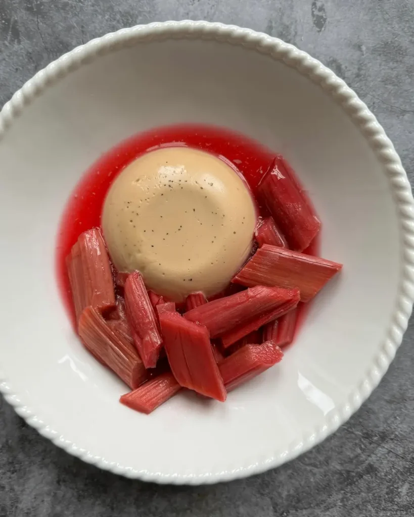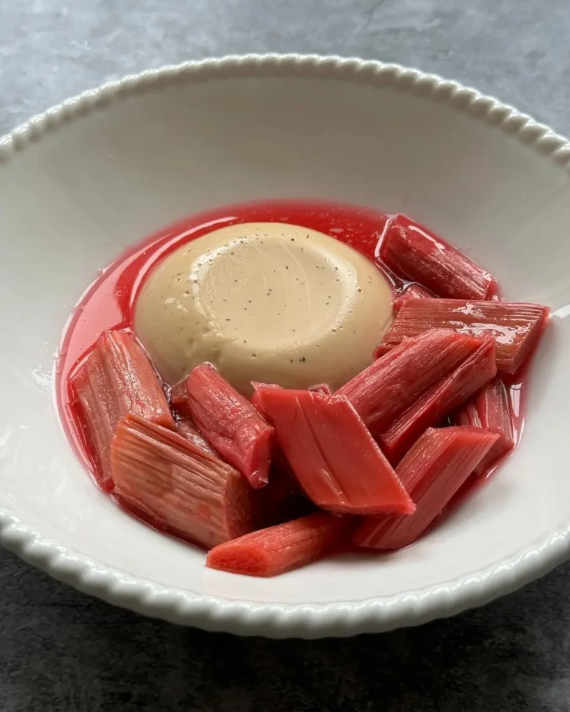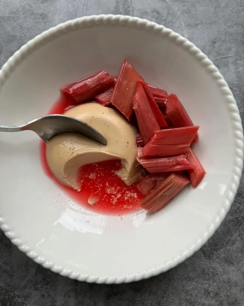 The contrast of cool, creamy custard and tart, ruby-red rhubarb creates a balanced mouthfeel.