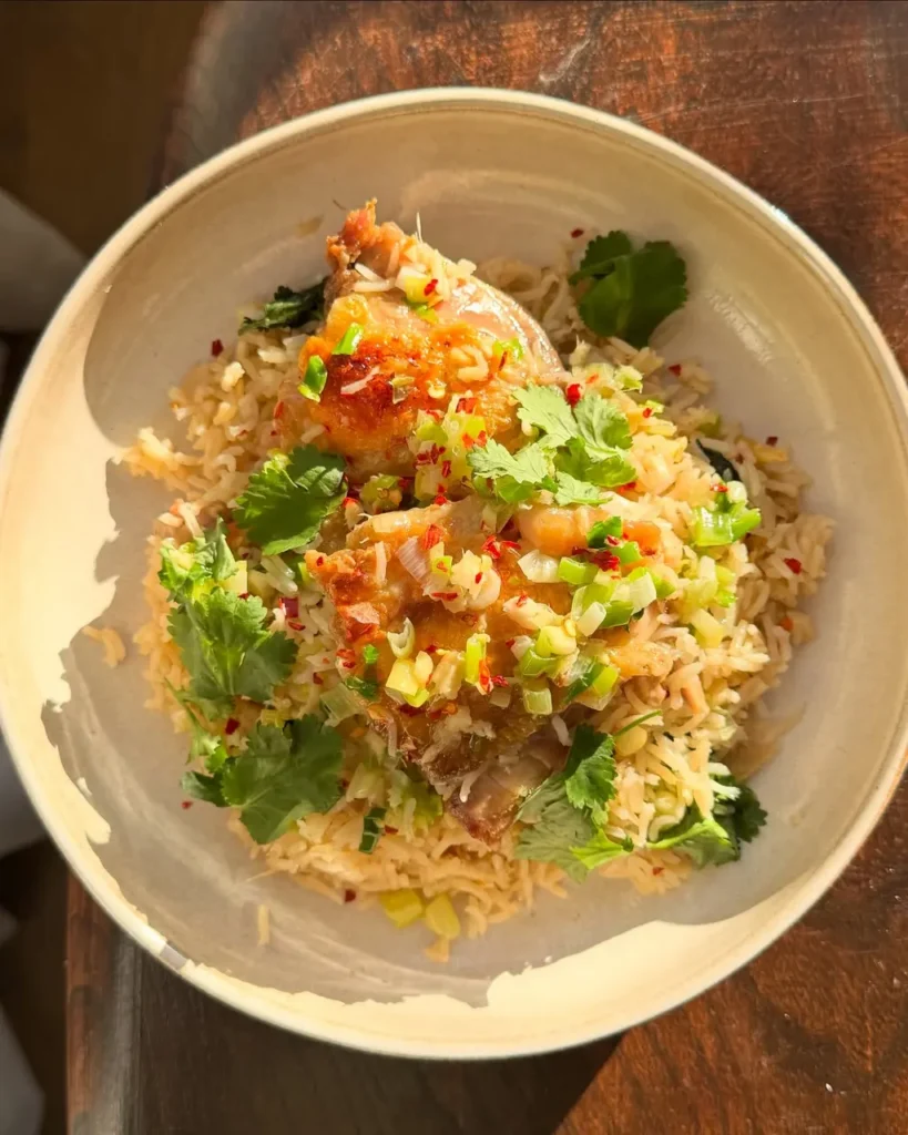 It’s layered with toasted rice, aromatic stock, and bone-in thighs that finish with gloriously crisp skin.