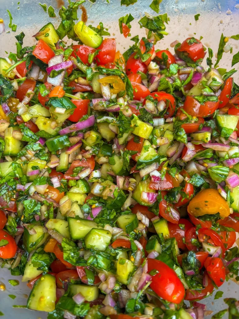 A simple mix of tomato, cucumber, onion, parsley, lemon juice, and olive oil works perfectly.