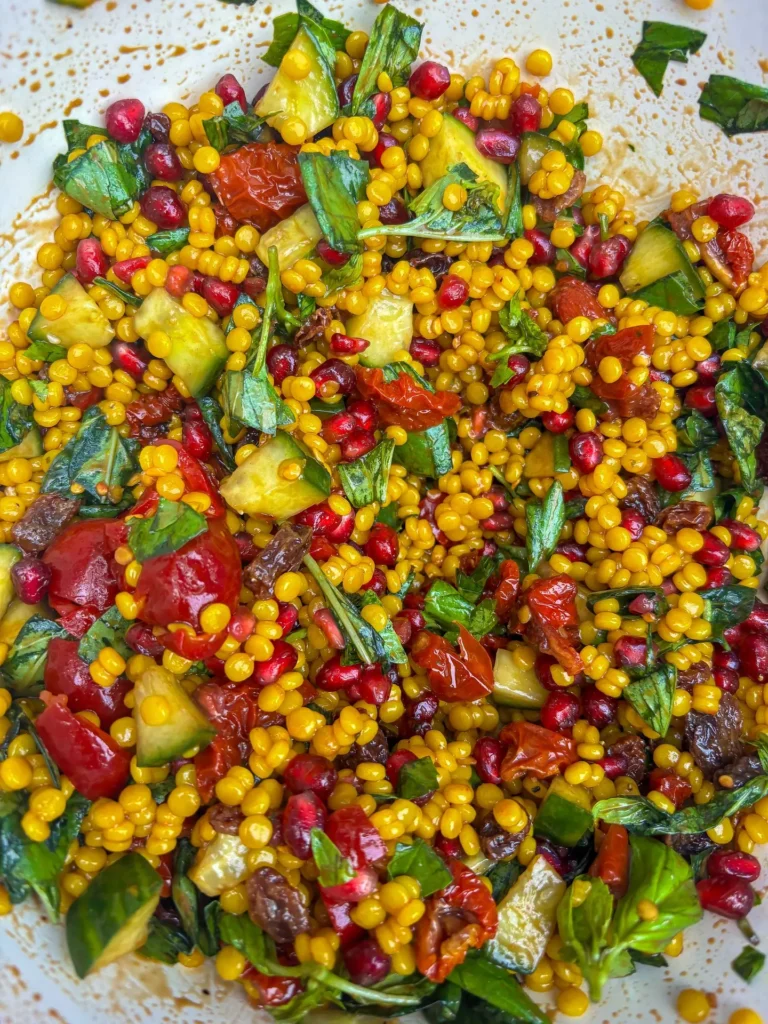 - Fluff the couscous with a fork and fold in sun-dried tomatoes, sultanas, cucumber, pomegranate seeds, balsamic vinegar, and fresh basil.