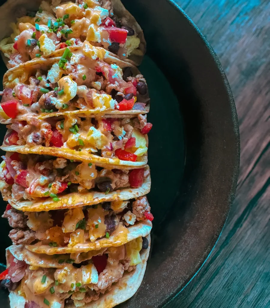 With a crispy tortilla base, a savory turkey-bean-tomato filling, fluffy scrambled eggs, and a touch of cheese and sauce, this dish turns breakfast into something you’ll crave every day.