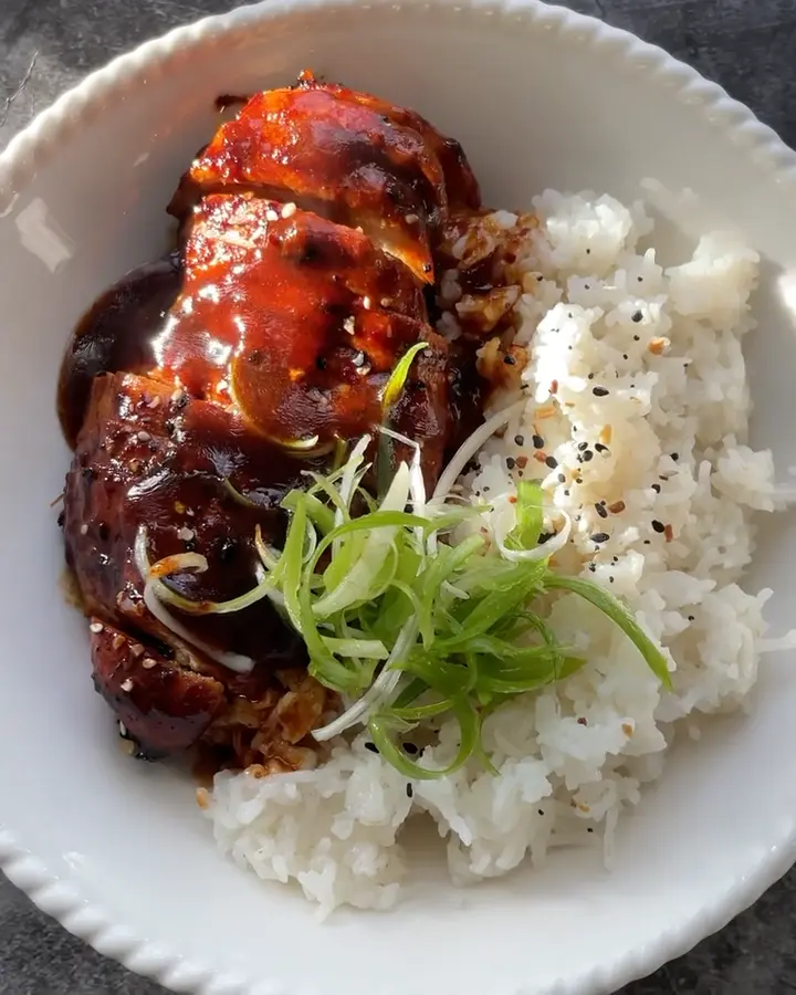 - Serve the sliced chicken over the cooked rice. Spoon over the remaining sauce from the baking dish, and garnish with spring onions and sesame seeds.