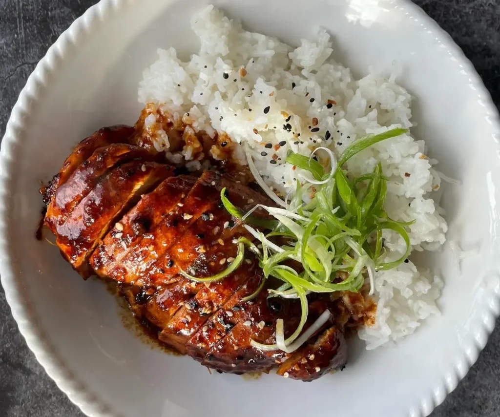 The sticky glaze clings to every bite, infusing tender chicken breast with layers of garlicky spice, citrus brightness, and deep caramelized sweetness.
