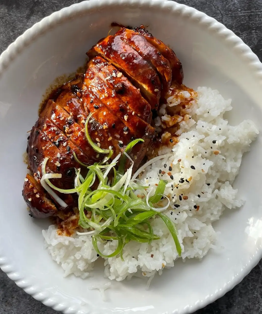 Slice the chicken into thick strips and arrange them over your warm rice. Spoon the remaining pan sauce over the top so every grain is coated with that glistening glaze. Add your curled spring onions and sesame seeds for a fresh, crunchy contrast.