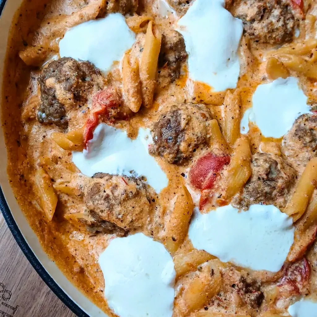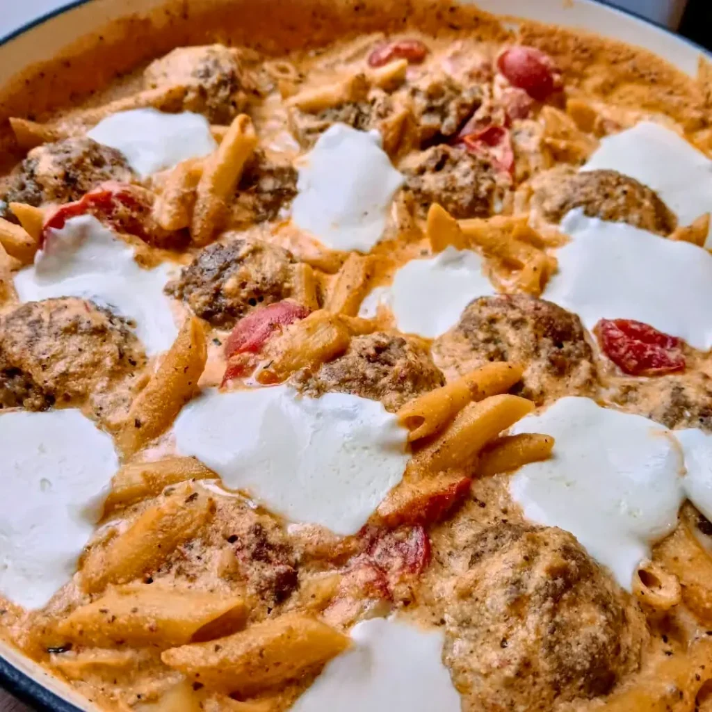 This creamy keto tomato pesto pasta bake proves that pasta night doesn’t have to be off-limits on a low-carb lifestyle. With flavorful turkey meatballs, a velvety sauce, and golden mozzarella on top, it’s a recipe that balances comfort and nutrition.