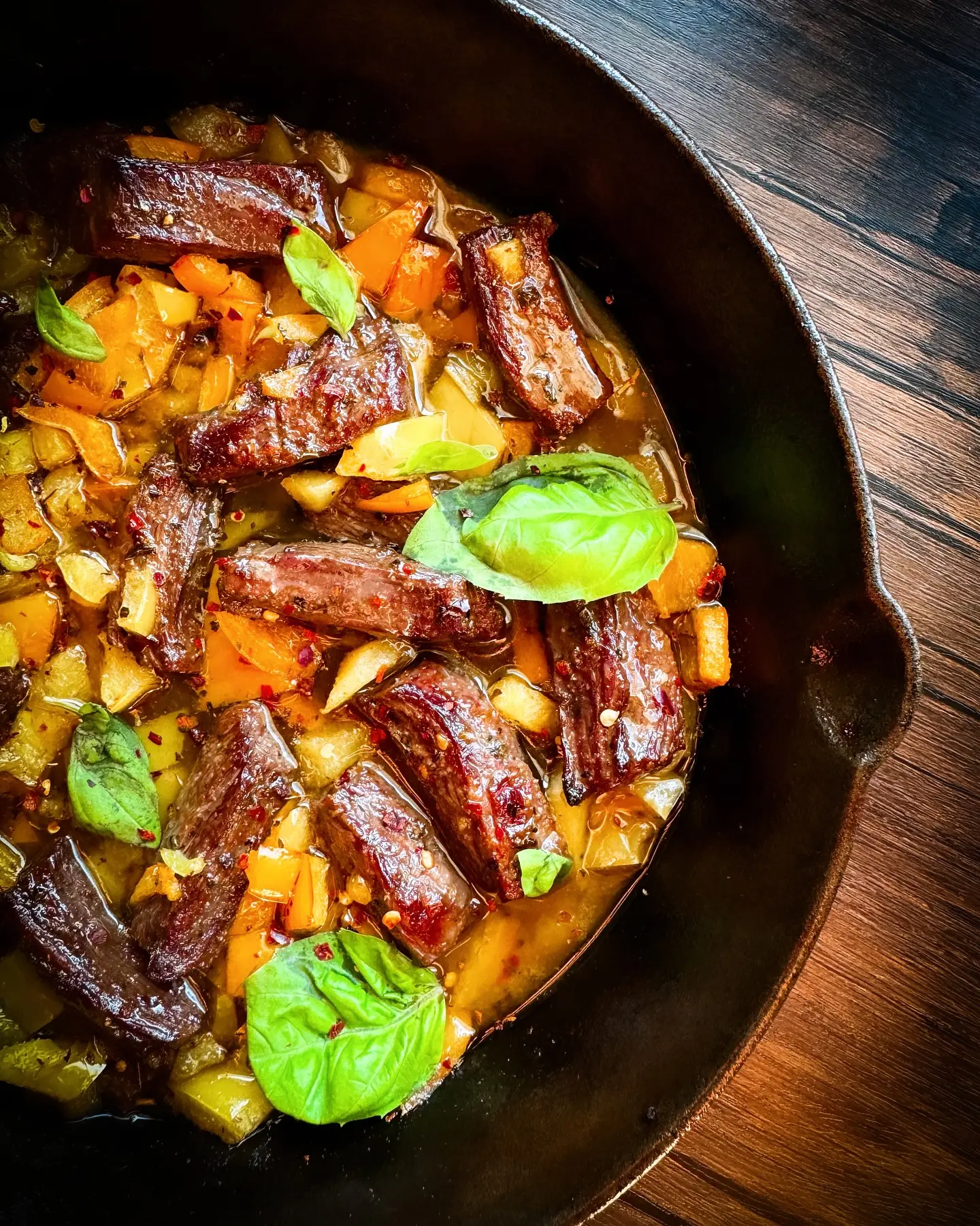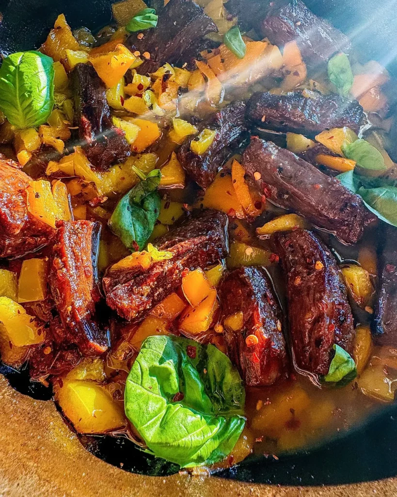 Fresh basil is added both before and after cooking for brightness. This combination avoids heaviness and allows the peppers and beef to shine equally.