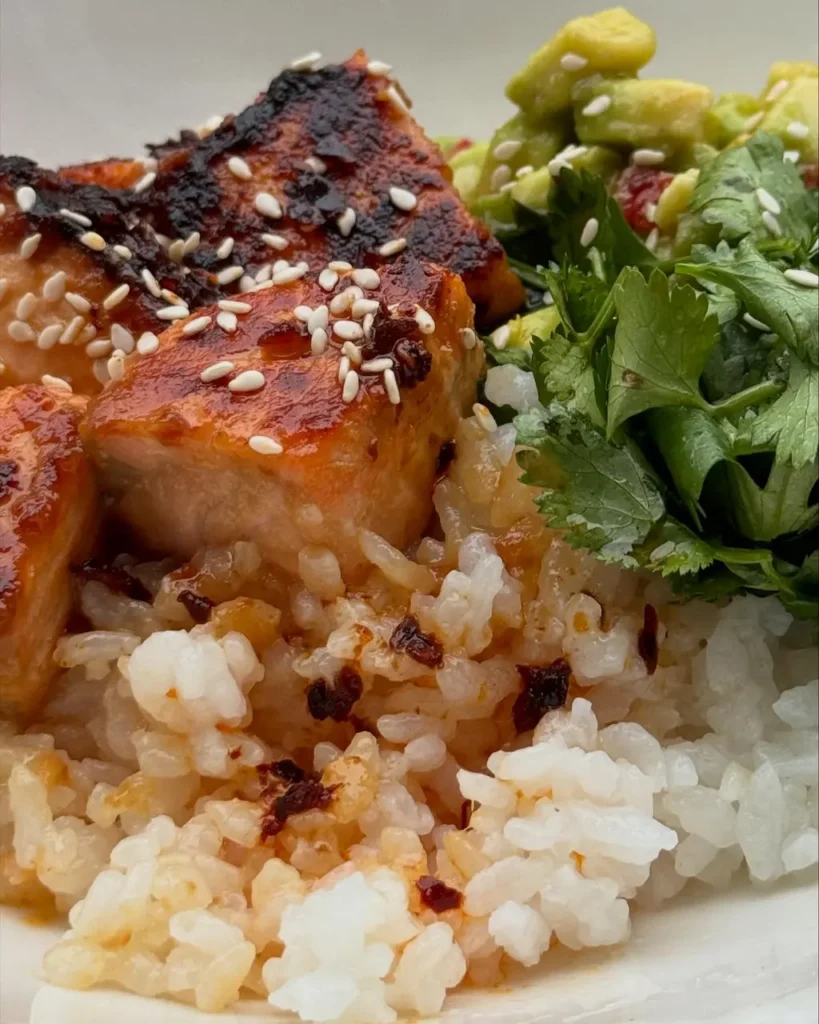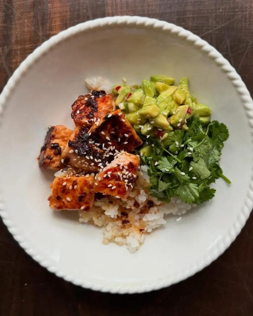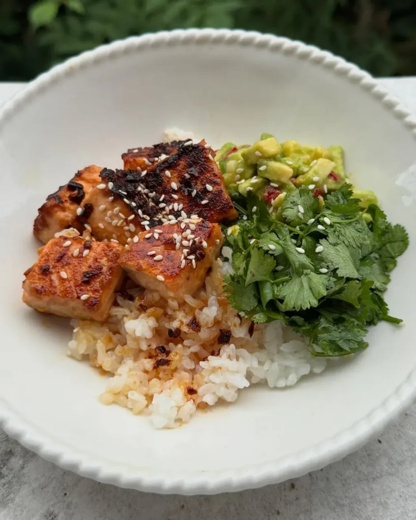 The format—rice, glazed salmon, and salsa—means you get balanced protein, carbs, and healthy fats in a single bowl.