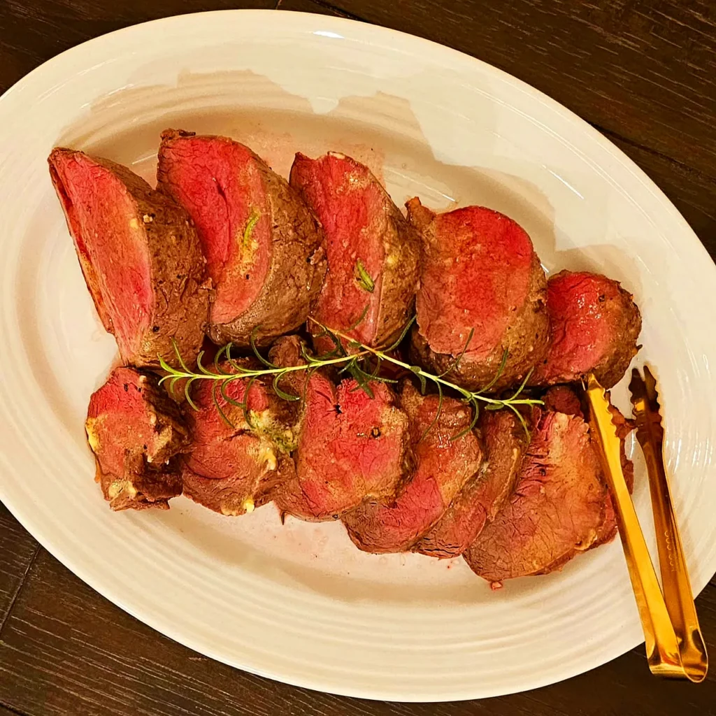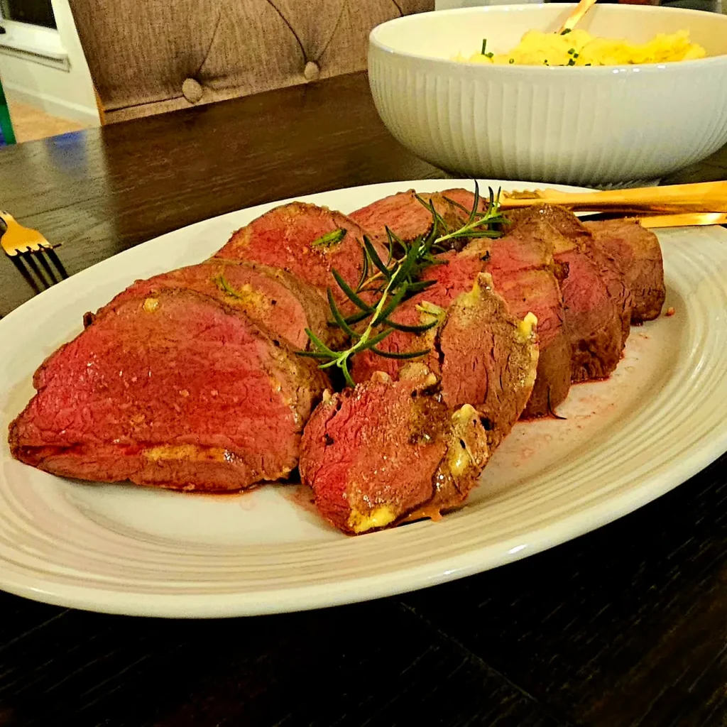 Rest the beef while you finish the mashed potatoes and prepare the compound butter. Slice the tenderloin thickly against the grain, spoon the warm horseradish Dijon rosemary butter over each slice, and plate with both potato styles for a composed look.