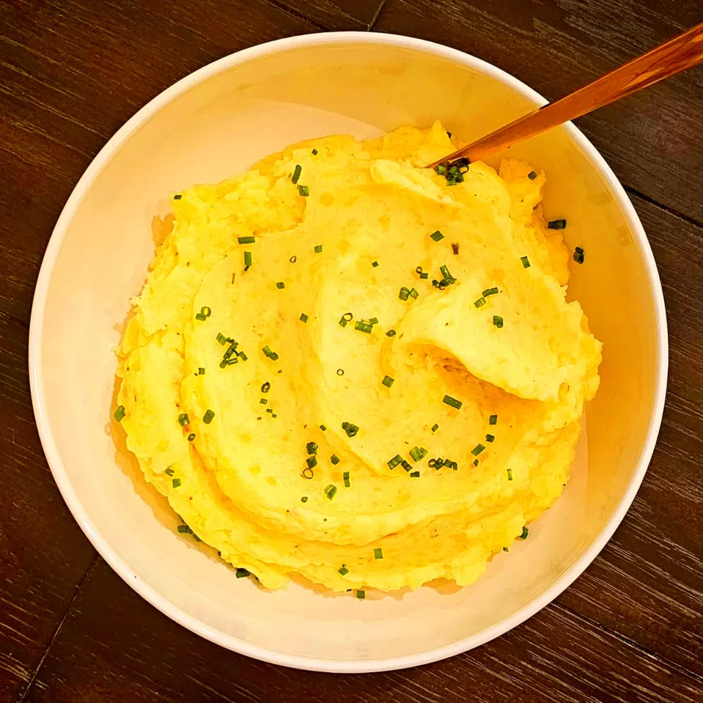 Choose Yukon Gold potatoes for a naturally buttery texture and less starch-driven glue than Russets. Boil in well-salted water until fully tender, drain thoroughly, and mash while still hot for a silky finish.