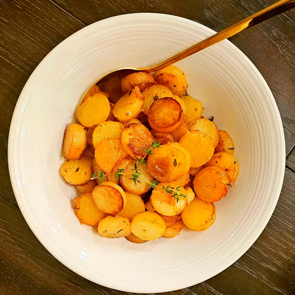 Cut Yukon Gold potatoes into uniform thick rounds and dry them completely before browning. Brown in a mix of butter and olive oil until each face is golden, then add smashed garlic and fresh herbs for aromatic base notes.