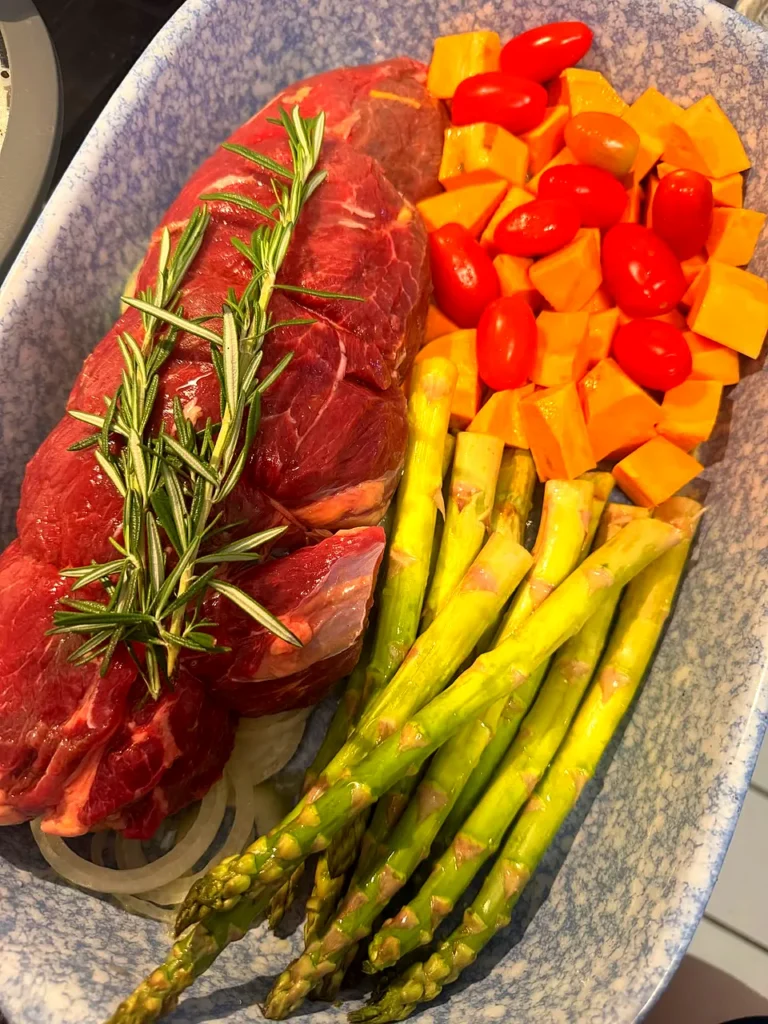 Ingredients (serves 4–6): 1 whole beef tenderloin (about 2–2.5 lb), 1 lb asparagus trimmed, 2 large sweet potatoes peeled and cubed, 1 cup cherry tomatoes, 1 large onion sliced, 2–3 tbsp olive oil, 2 tsp smoked paprika, 1 tsp black pepper, 1 tsp garlic powder, 1 tsp dried thyme, 1 cup low-sodium beef stock plus 1 tbsp balsamic vinegar, salt to taste.