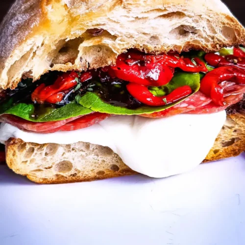 Roasted red peppers follow, bringing sweetness and depth. These peppers, whether homemade or jarred, are the sandwich’s flavor highlight. Their smokiness pairs perfectly with the creamy mozzarella and salty salami.