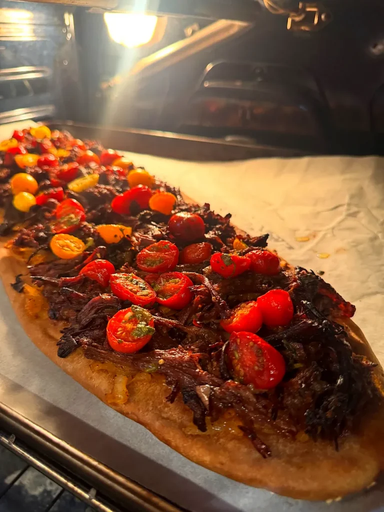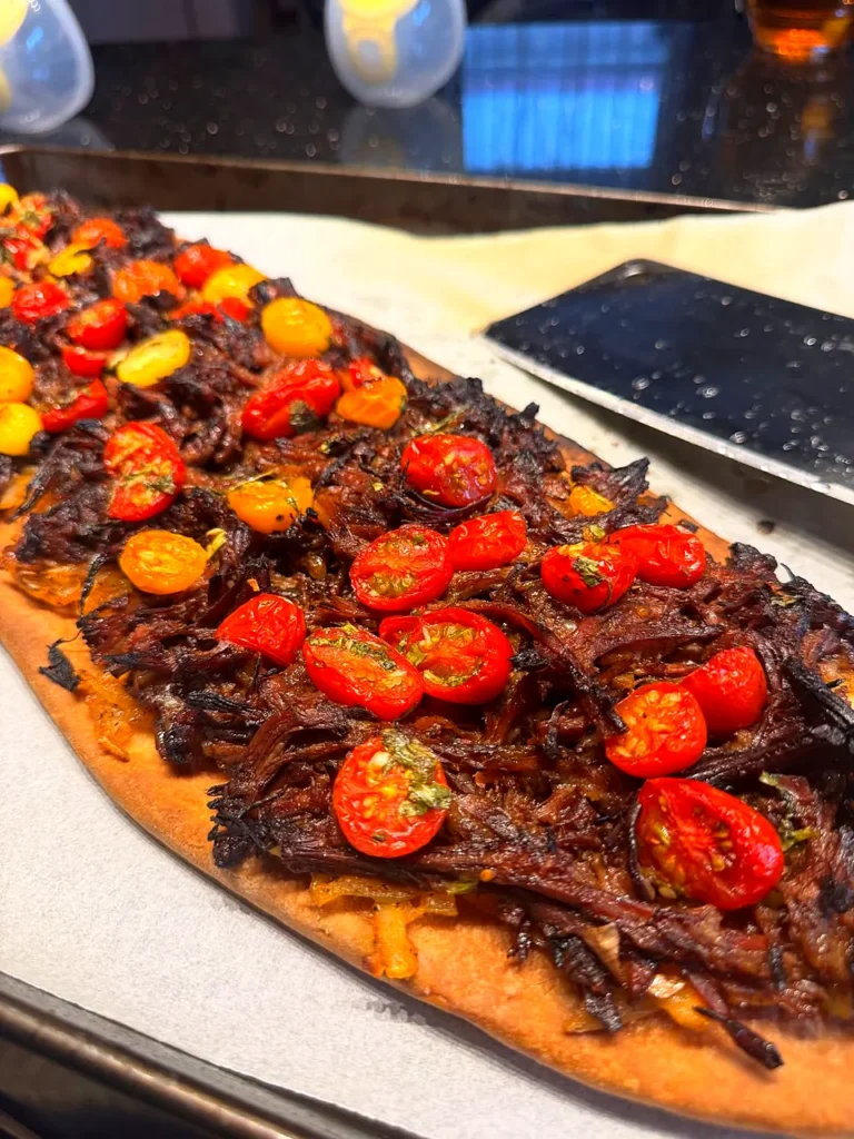 Slow-Braised Shredded Beef Flatbread with Cherry Tomatoes