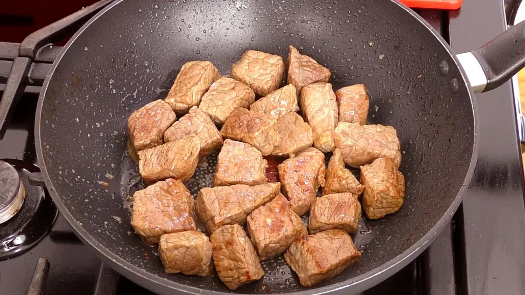 - Heat the olive oil in a large frying pan over high heat. Add the diced beef in batches and brown on all sides until lightly caramelized.