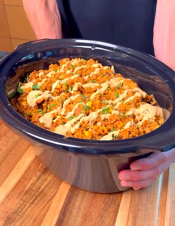 - Add cooked rice into the slow cooker and gently combine with the chicken mixture.