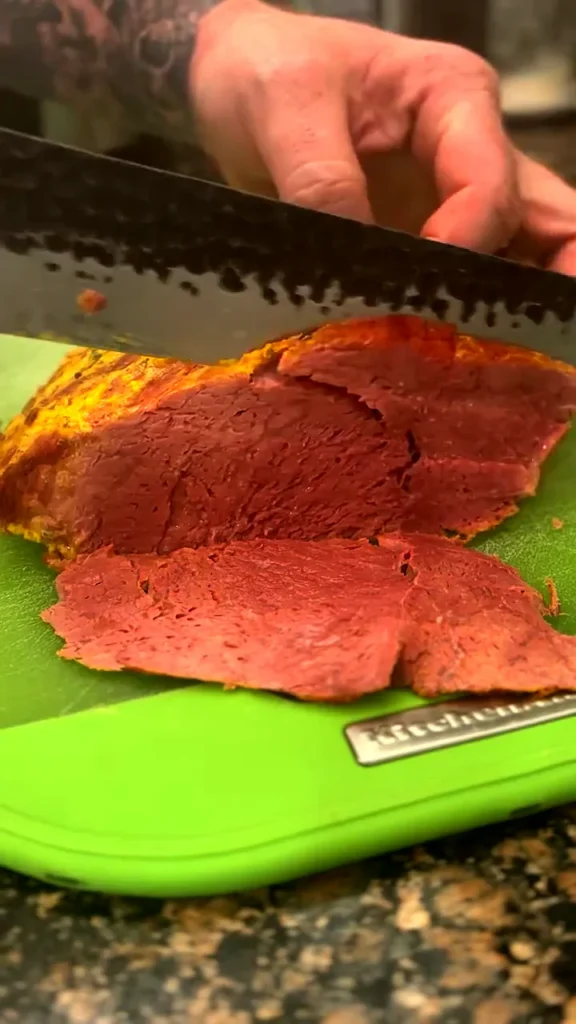 - Remove from the oven and let the beef rest for 15 minutes before slicing against the grain and serving.