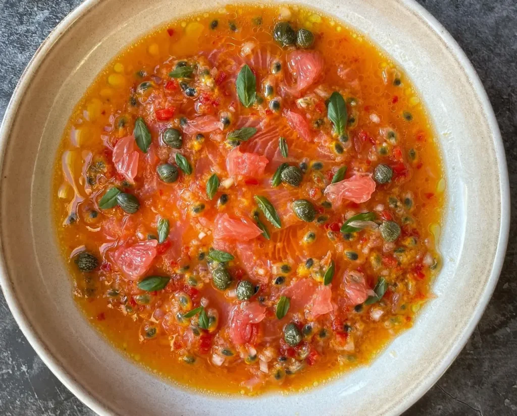 A plate of smoked trout crudo with grapefruit, passionfruit, and chilli is more than a meal — it’s a moment of sunshine, color, and texture.