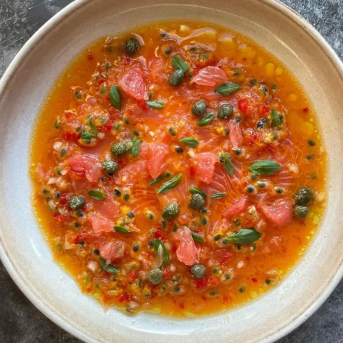 A plate of smoked trout crudo with grapefruit, passionfruit, and chilli is more than a meal — it’s a moment of sunshine, color, and texture.
