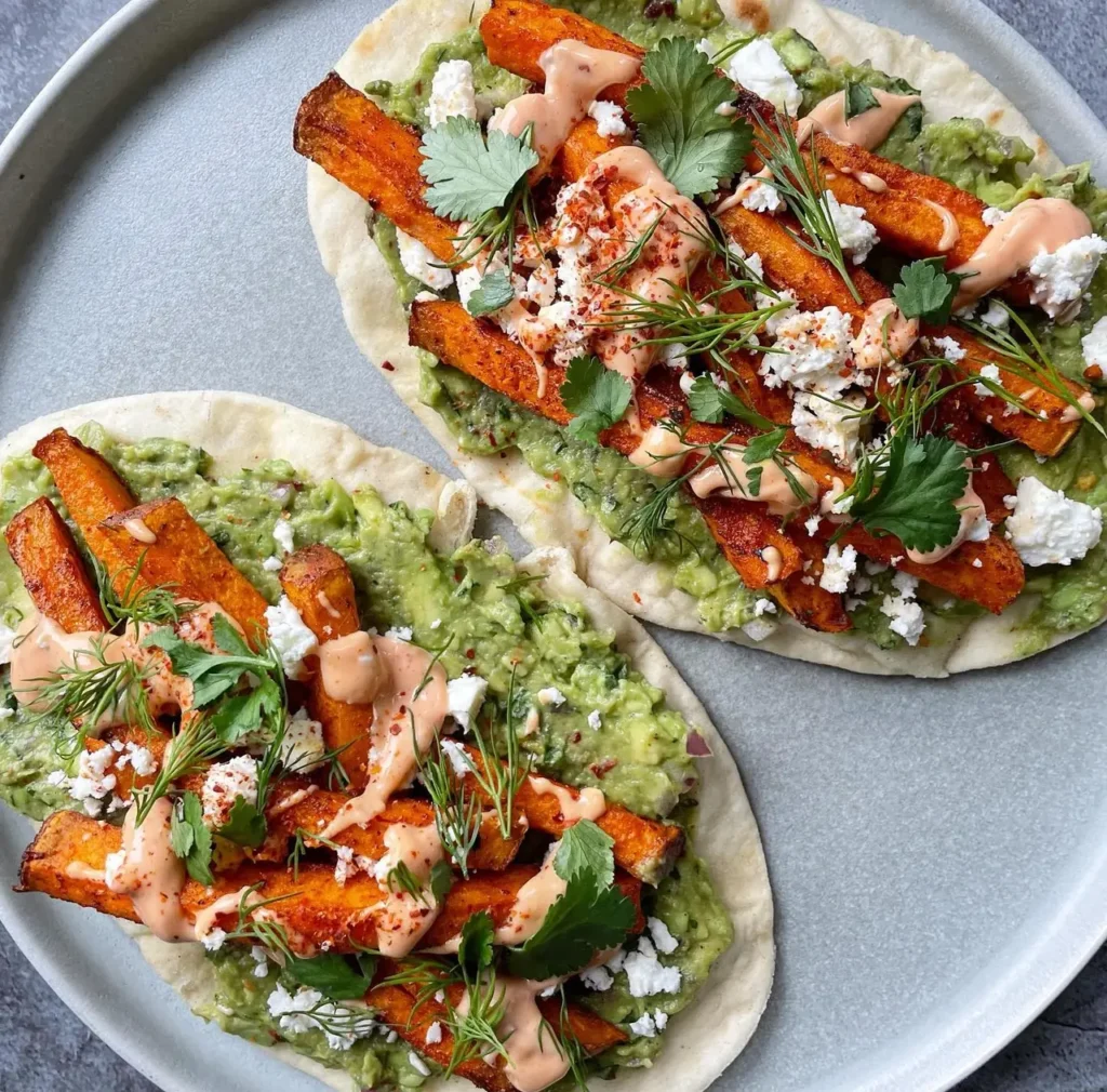 They’re loaded with crispy roasted sweet potatoes, creamy guacamole, tangy feta, and a drizzle of spicy mayo that ties everything together.