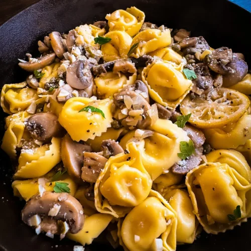 Think of it as pasta comfort food with a refined twist—the tang of fresh lemon, the savory bite of capers, and the earthy depth of mushrooms, all wrapped around plump cheese-filled tortellini.